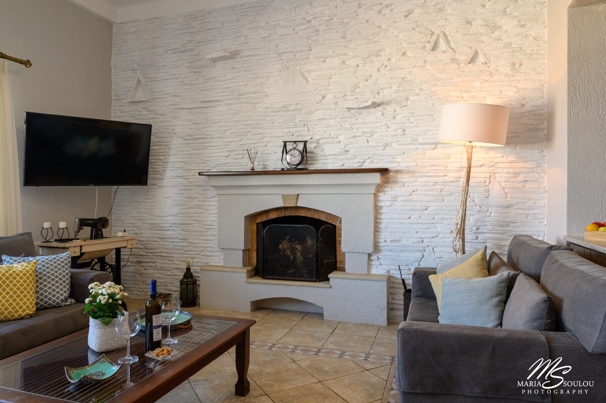 Dásamlegur fagurfræðilegur staður í Kantouni, fullbúinn og útbúinn. Gestir hafa aðgang að trjágarðinum með ávöxtum til að safna. Hér er einnig hægt að slaka á í fallegum garði hússins. Húsið er staðsett nálægt Kantouni-strönd (3 mínútna gangur), vinsælum börum, veitingastöðum og matvöruverslun. Tilvalinn staður fyrir fólk sem er að leita sér að góðu fríi.