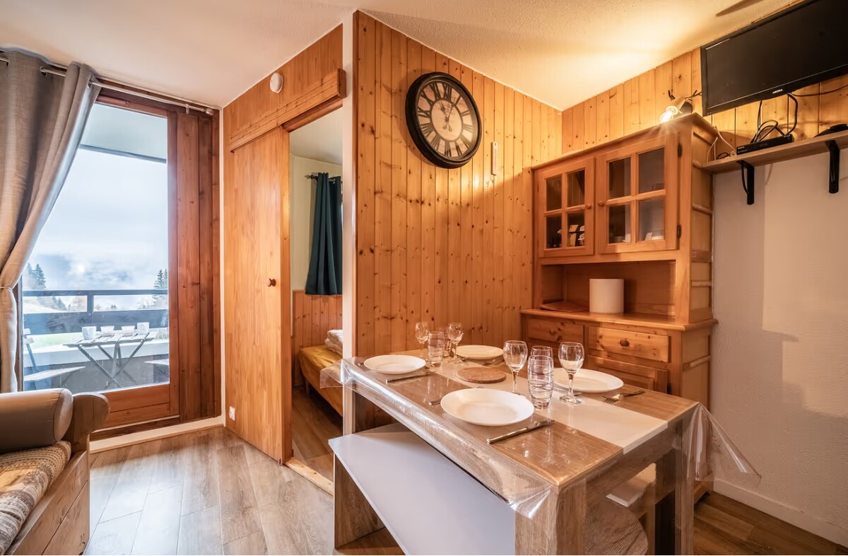 Stúdíó á 2. hæð. Í hjarta dvalarstaðarins (um 270 km af rennibraut). Staðsett í suðurátt, 20 m2, svalir, bílastæði og skíðaherbergi. Baðherbergi með sturtu, salerni, þvottavél. Vel búið eldhús, sjónvarp, útsýni yfir dvalarstaðinn. 2 skref frá brekkunum og skíðalyftunum (tæplega 5 mínútna göngufjarlægð), ég útvega ekki rúmföt, handklæði og viskustykki. Ræstingagjald ef þetta hefur ekki verið gert. 20% til 30% afsláttur af leigunni.