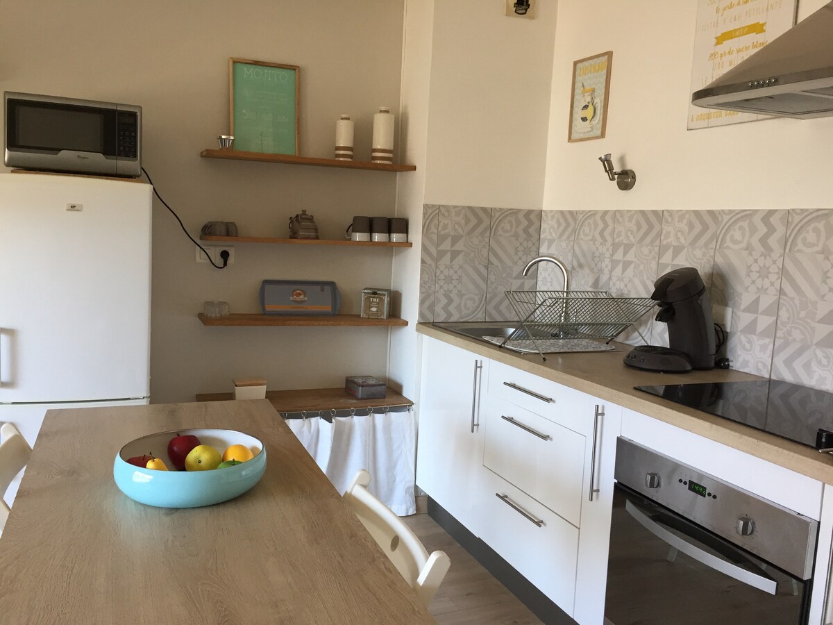 Komdu og kynntu þér leiguna okkar í litlu húsnæði sem er í 20 metra fjarlægð frá ströndinni. Íbúð T2 alveg endurnýjuð 42 m2 staðsett á 2. hæð með svölum og sjávarútsýni. Samsett úr eldhúsi sem er opið í stofu með breytanlegum sófa fyrir daglegan svefn í 160x200. Stórt svefnherbergi með 160X200 rúmfötum, skrifstofa fyrir fjarvinnu, fataherbergi. Baðherbergi með stórri sturtu, aðskilið salerni. Sjónvarp, Fiber Internet, loftkæling, 1 bílastæði í húsnæðinu. Nálægt öllum verslunum