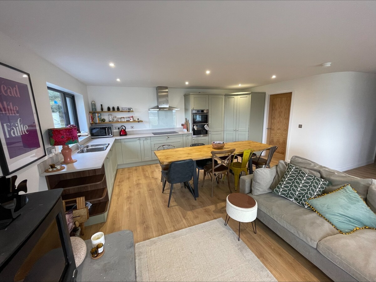 Slakaðu á með allri fjölskyldunni á þessu friðsæla afdrep við sjávarsíðuna á villta Atlantshafsströndinni með töfrandi útsýni yfir ströndina, fallegustu strendurnar rétt hjá þér... Slakaðu á og slakaðu á í þessu notalega en rúmgóða, stílhreina Beachhouse með öllu sem þú þarft ...... Þessi falda gimsteinn hefur upp á svo margt að bjóða . Slakaðu lengi á undir stjörnubjörtum himni í heita pottinum utandyra eftir að hafa skoðað allt sem þetta litla himnaríki hefur upp á að bjóða.