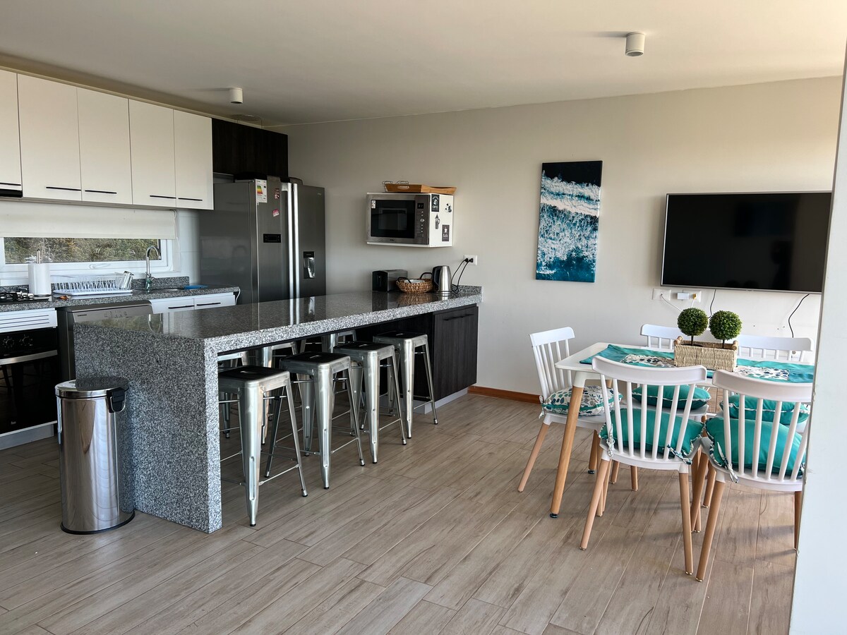 Stórkostleg íbúð í fremstu röð í Puerto Velero - Tongoy, fyrir 6 manns, besta útsýnið, nálægt ströndinni með stíg, stiga eða kláfferju, sem fer niður að henni. Einnig metra frá göngustígnum að sjó og ferskvatnslaugum, smábátahöfn og tveimur stórkostlegum veitingastöðum; þú munt alltaf finna einn opinn! Á staðnum er: Hraðbanki, öryggisgæsla, árstíðabundinn matvöruverslun, hárgreiðslustofa, heilsulind, verslanir, ræktarstöð, grillsvæði, tennisvöllur, fótbolti, róður.
