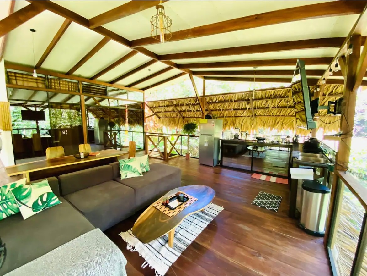 Take it easy at this unique and tranquil getaway. Enjoy the peaceful ambiance of nature while experiencing stylish modern comforts. This space was designed to create life long memories. From the traditional roof structure to the glass panelling, this bungaló was built using a mix of natural and modern materials and finishes. Enjoy the peace and magic of the jungle as you watch the leaves fall from the trees all around you.
