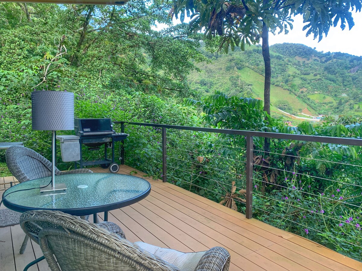 stylish luxury guesthouse nestled in a lush tropical garden with private access to the river, in the foothills of mount Chirripó, features all high end amenities: king size bed, high speed internet, full kitchen, plunge pool, your own driveway and parking. perfect for a romantic get away and to reconnect with nature, take a dip in the clear mountain water before breakfast or a candlelight dinner on the spacious deck or just watch the birds fly by soaking in the outside tub
