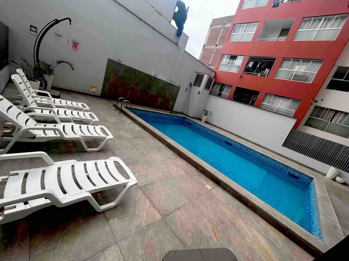 Nálægt öllu í Lima! 🏙️ Þú átt eftir að elska þessa nútímalegu íbúð vegna frábærrar staðsetningar í miðbænum. Staðsett í aðalbyggingu með ókeypis sameiginlegum svæðum og öðrum greiddum viðbótarsvæðum sem eru hönnuð til þæginda fyrir þig. Fullkomið fyrir ferðamenn, sjúklinga í læknismeðferð, stjórnendur eða ferðamenn sem vilja vera vel tengdir í Lima. ✨ Okkur er ánægja að taka á móti þér og hjálpa þér að njóta dvalarinnar til fulls!