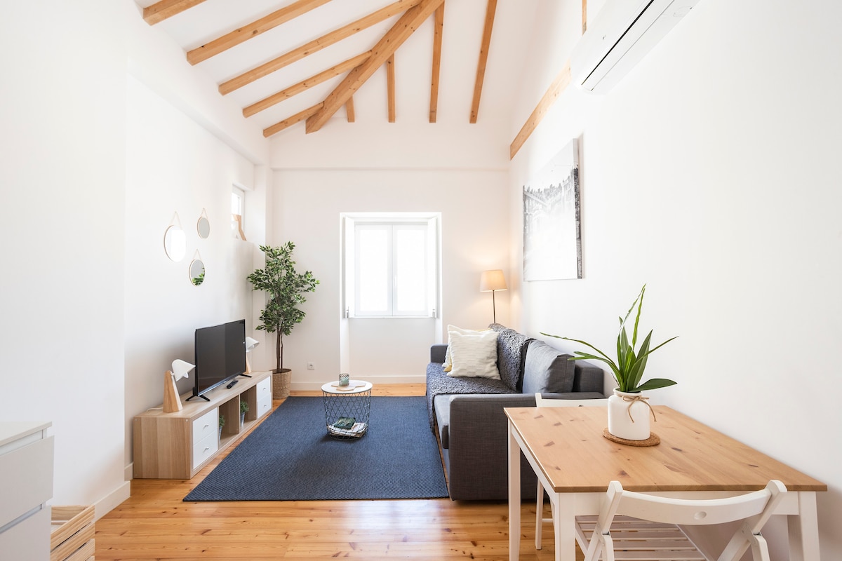 Þessi eign er með stórkostlegt útsýni yfir ána Tagus og ber af vegna brenndu viðarloftanna í gylltum tónum sem skapa einstakt og fágað andrúmsloft og svalanna með beinu útsýni yfir ána. Þetta nútímalega loftíbúð rúmar allt að 4 manns á 94 m². Hún er staðsett á 4. hæð byggingar með lyftu í hjarta dæmigerðs Alfama-hverfisins. Þú getur gengið að öllum helstu stöðum borgarinnar, sem gerir þessa staðsetningu að forréttindaaðgengi að borginni Lissabon.