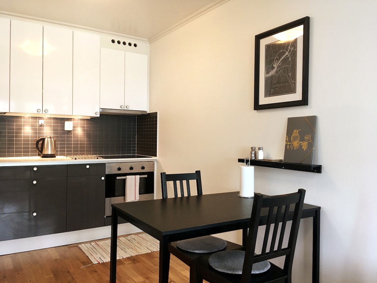 Apartment of 28m2 with private entrance in a family villa. Located in a quiet and green area with walking distance to Liseberg and the center (about 20 mins). Furnished with dining table, sofa and double bed. Fully equipped kitchen. Large bathroom with washing machine. Close to several bus stops, grocery stores and smaller restaurants. Two green areas with gym and exercise track within 5 min. walking distance. Free parking at the street outside. Welcome!