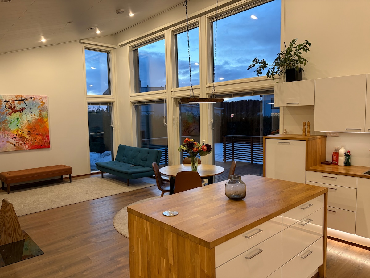 Þessi nýja viðaríbúð er fyrir þig að leita að rólegri og vandaðri íbúð. Innritun fer fram áreynslulaust með lyklaboxi. Íbúðin er með öllum þægindum í dag, gluggarnir eru yfirfullir af ljósi að innan og andrúmsloftið verður til af breiðum gólfum borðstofugólfum og mikilli hæð í herberginu. Gæði heimilisins eru almennt mikil. Ökumaðurinn getur fengið bíl á einkabílastæðinu sínu. Íbúðin er með eigin verönd svo þú getur notið morgunkaffisins utandyra. Þessi staður býður upp á frábæran nætursvefn!