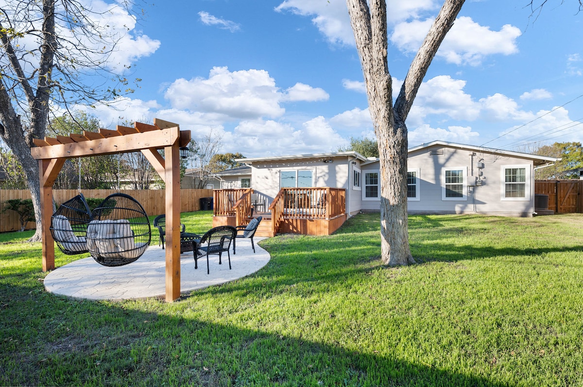 Welcome to your private getaway. This adorable home is the perfect place for you and your family. Four bedrooms and a King size primary bed sleeps 8 comfortably. Grill under a charming pergola, roast marshmallows by the fire pit, and relax with family & friends in this spacious backyard retreat with plenty of seating and comfortable swing chairs. Game room with Air Hockey and ample interior/exterior seating provides the perfect spot for your family entertainment.