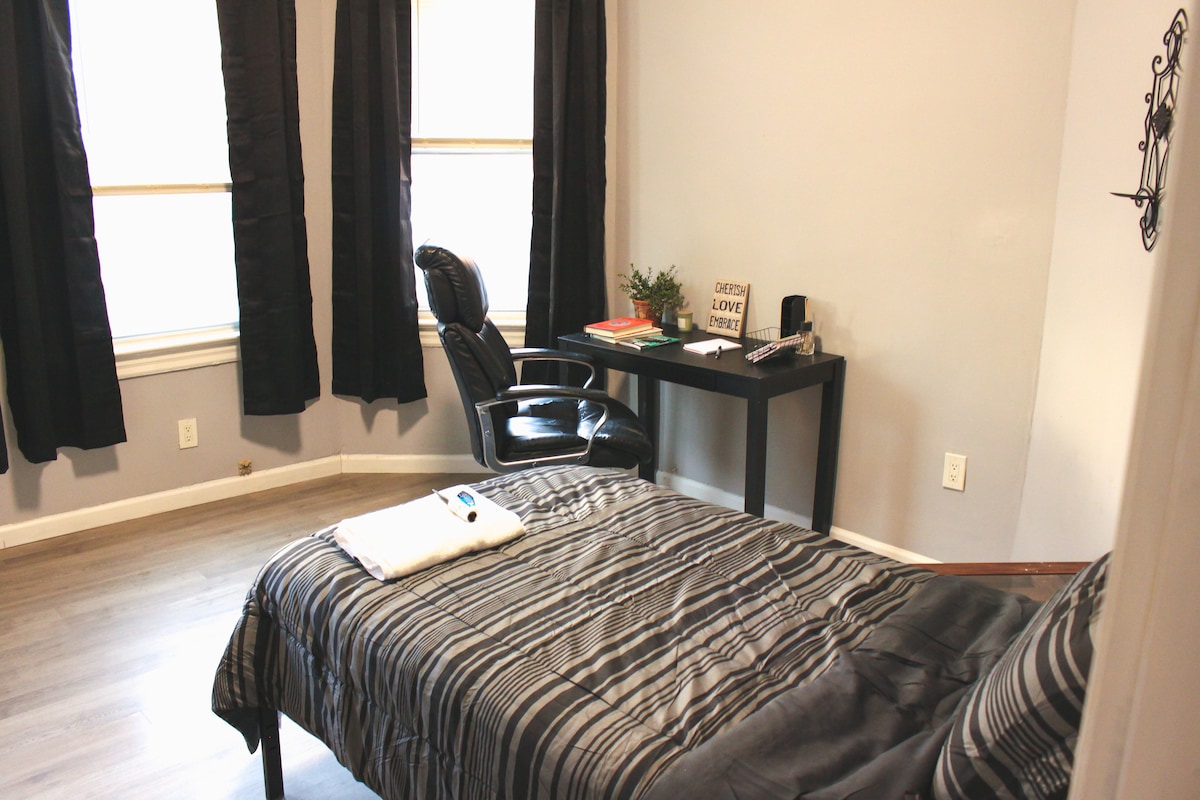 Gleymdu áhyggjum þínum í þessu rúmgóða og kyrrláta rými. Þetta er frábært fyrir alla háskólanema í Montclair State eða Seton Hall University. Þetta er einnig frábær staður fyrir alla sem vinna á St. Barnabas Hospital! Þetta er einkarekið stúdíó með sérbaðherbergi í hálfgerðu baðherbergi. Það er borðstofa og eldhúskrókur með ísskáp, örbylgjuofni, hraðsuðuketli, kaffivél, síuðu vatni og vaski. Það er alveg einkalegt frá restinni af kjallaranum og heimilinu.