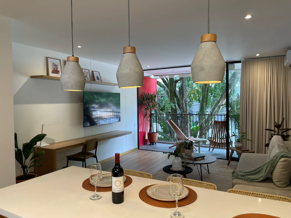 Slappaðu af í þessari rúmgóðu íbúð með 1 svefnherbergi og nútímalegum innréttingum með loftkælingu og einkaverönd með grilli sem hentar fullkomlega til að borða utandyra og slaka á. Njóttu úrvalsþæginda í hinni virtu byggingu Energy Living: magnaðrar endalausrar þaksundlaugar á 22. hæð, fullbúinnar líkamsræktarstöðvar, afslappandi gufubaðs og Alquimista-veitingastaðarins á staðnum allan daginn. Stutt í stórmarkaðinn Carulla og líflega verslunarmiðstöð þar sem finna má yndislega veitingastaði!