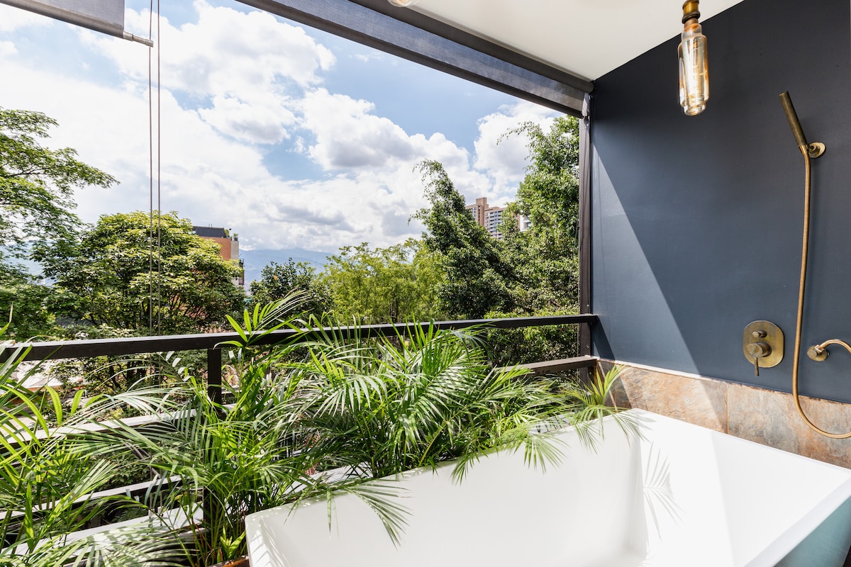 Experience Medellín in this stylish and exclusive open-plan studio near Parque Lleras with private jacuzzi, A/C, king-sized bed, 54" rotating smart TV, Netflix, workspace with high-speed Wi-Fi, fully equipped kitchen, washer/dryer, tea/coffee station, and black-out curtains. Enjoy amazing city views, superb interior design and finishes, gym, sauna, swimming pool, and on-site bars, restaurants, cafeteria, and art gallery — the ultimate exclusive retreat for comfort, style, and vibrant nightlife.