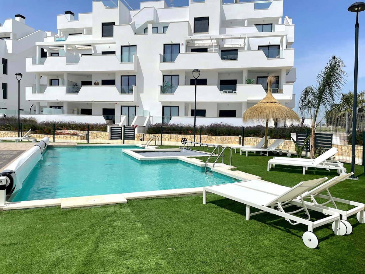 Skemmtu þér með allri fjölskyldunni í þessari glæsilegu gistingu. Góð íbúð með þakverönd þar sem þú getur notið sjávarútsýni, með sameiginlegum svæðum eins og upphituðum sundlaugum, gufubaði, sundlaugarbar, grilli, einka yacuzzi o.s.frv. Mjög vel staðsett , við hliðina á matvörubúð , ströndum , verslunarmiðstöð , flóamarkaði á laugardögum. Mjög sólríkt. Þú þarft ekki bíl til að eyða góðu fríi