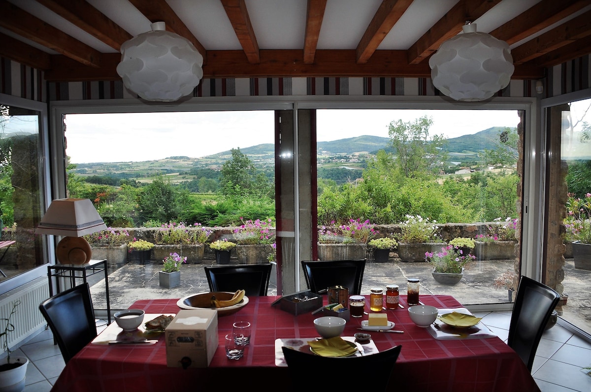 Retrouvez vous en famille ou amis dans un logement authentique au cœur d'une magnifique propriété familiale dans le Beaujolais des pierres dorées. Promenez-vous dans le parc et profitez d'un environnement paisible à seulement 30 mn de Lyon, 7 mn de Villefranche s/s. Vous bénéficiez d'une cuisine indépendante. Pour la formule Gîte, le petit déjeuner, les draps et les serviettes ne sont pas fournis ; si vous voulez ces options, voir les offres en chambres d'hôtes