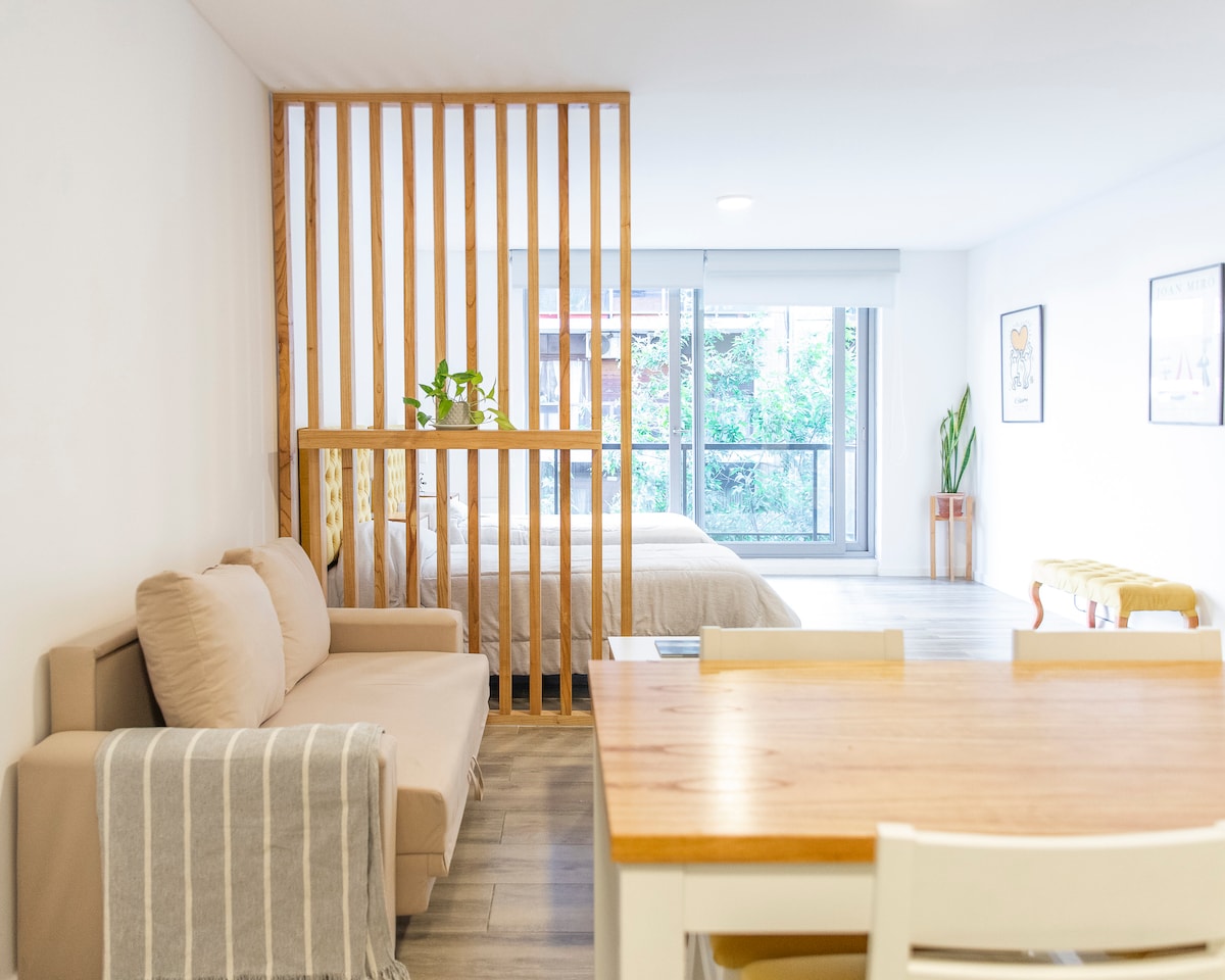 Nútímalegt stúdíó með opnu útsýni í hjarta Caballito-hverfisins. Fullbúið fyrir fullkomna dvöl! (Grill og líkamsrækt innifalin!) Staðsett í einu af fallegustu og einkaréttum svæðum Caballito. 3' to 'Primera Junta' subway station, the quiet and beautiful 'Barrio Ingles 'and the renovated Av. Pedro Goyena! Super bright and comfortable for up to 3 people (2 adults and a kid), equipped with ✔ High-speed Wifi ✔ Amazon Fire TV/Netflix ✔ A/C ✔ balcony ✔ terrace ✔ washing/dryer machine!