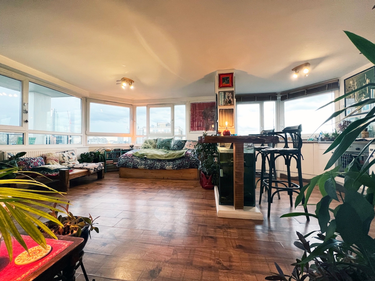 Verið velkomin í glæsilegu þakíbúðina okkar í London. Njóttu 180 gráðu útsýnis yfir sjóndeildarhringinn í London frá einkaþakveröndinni þinni. Fullkomlega staðsett til að skoða alla borgina, með neðanjarðarsamgöngum allt í stuttri göngufjarlægð. Byggingin er með útsýni yfir Regent's Canal og er beint á móti Shoreditch Park. Hér er einnig fjölskylduvænn pítsastaður, kaffihús, líkamsræktarstöð og stórmarkaður - allt í byggingunni. *Viðbótarhúsreglur eiga við. Vinsamlegast lestu þær áður en þú bókar.