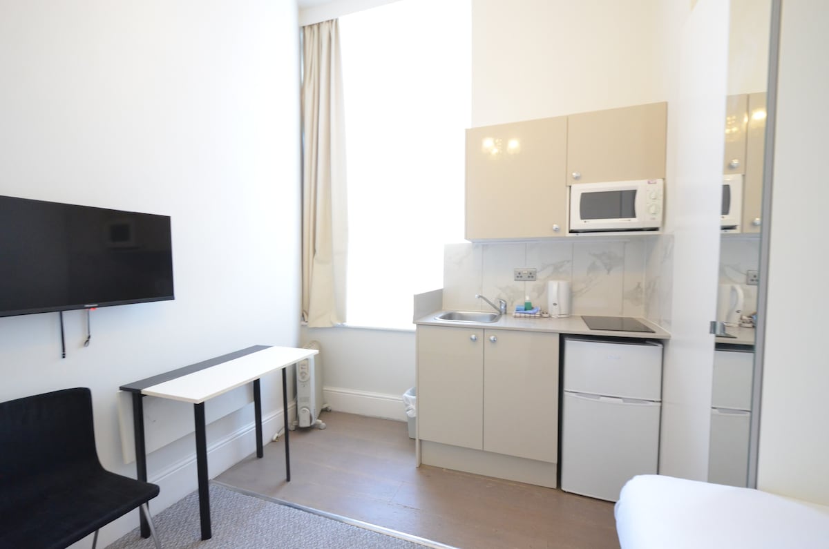 Mjög miðsvæðis, íbúð í kjallara (45fm) , 3 manna pláss. Hentar ekki börnum yngri en 2ja ára og börnum sem teljast vera ein manneskja. Sérinngangur, 1 svefnherbergi, 1 stofa, 1 eldhús og 1 baðherbergi. Nálægt Oxford street, Regent street og Bond street shopping areas, Soho bars and restaurants area, museums and theatres . Við erum með hraðskreiðustu trefjarnar í Bretlandi sem henta fullkomlega fyrir streymi/skýjageymslu. Þú getur unnið heiman frá þér með þráðlausa eða þráðlausa nettengingu á tilgreinda skrifstofusvæðinu.