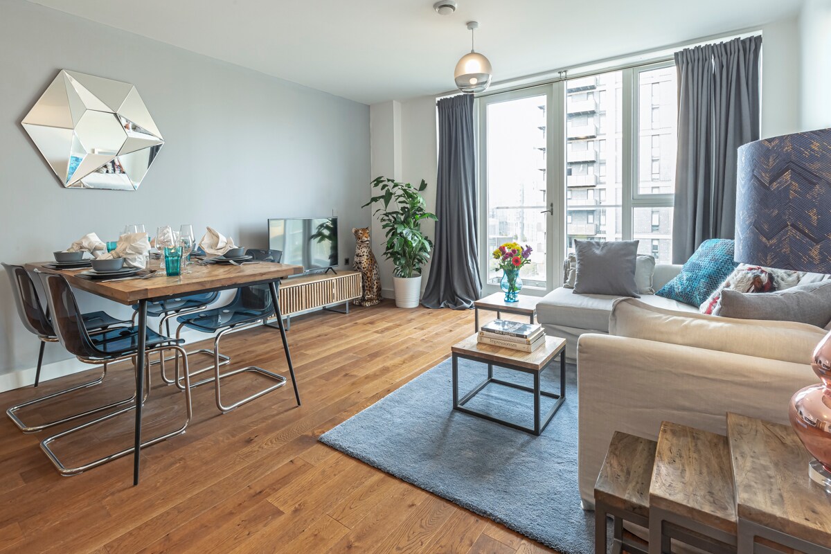 Rúmgóð 60 m2 / 645 fermetra íbúð með 1 rúmi (sjaldgæft í London) í nútímalegri blokk með aðgengi að lyftu. Á 4. hæð er bjart, hljóðlátt og þar eru gluggar frá gólfi til lofts, svalir og þægileg stofa. Aðeins 7 mín á stöðina, 10 mín á Greenwich og 15 mín á London Bridge. +3 matvöruverslanir í innan við 2 mín göngufjarlægð. Ókeypis bílastæði við götuna Helstu þægindi: • King-rúm með úrvals Eve-dýnu • 55" háskerpusjónvarp • Vinnuborð • Þvottavél/þurrkari • Nespresso • Uppþvottavél.