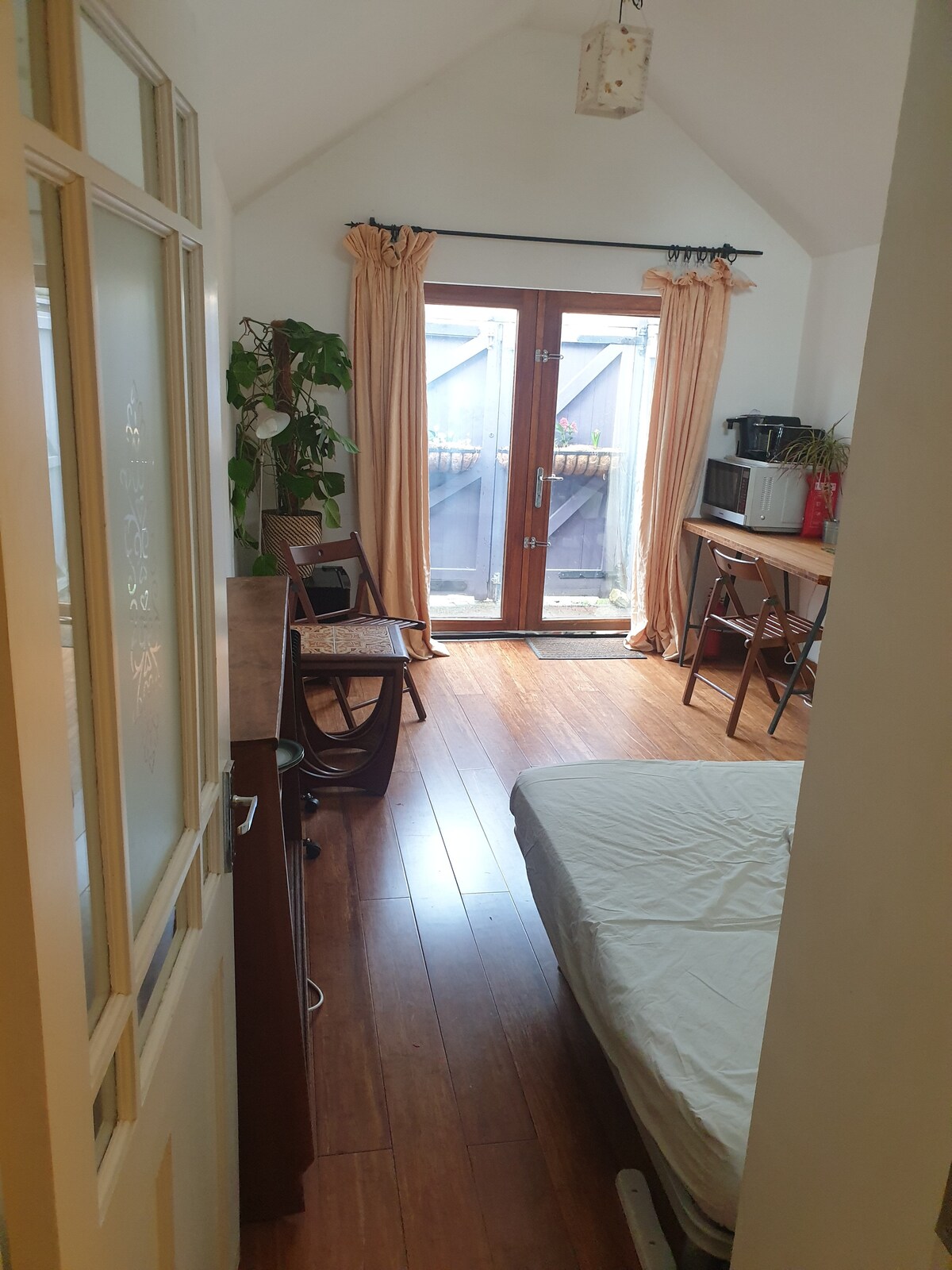 This is a bedroom and bathroom on the ground floor with its own entrance and very small patio. There is a microwave, mini fridge,toaster, eco kettle and nespresso style coffee maker. There is no kitchen or lounge. There is a wet room with shower and toilet. It is a good sized room with a high ceiling wooden floors and double patio window doors. There is a space to work at. There is no TV.