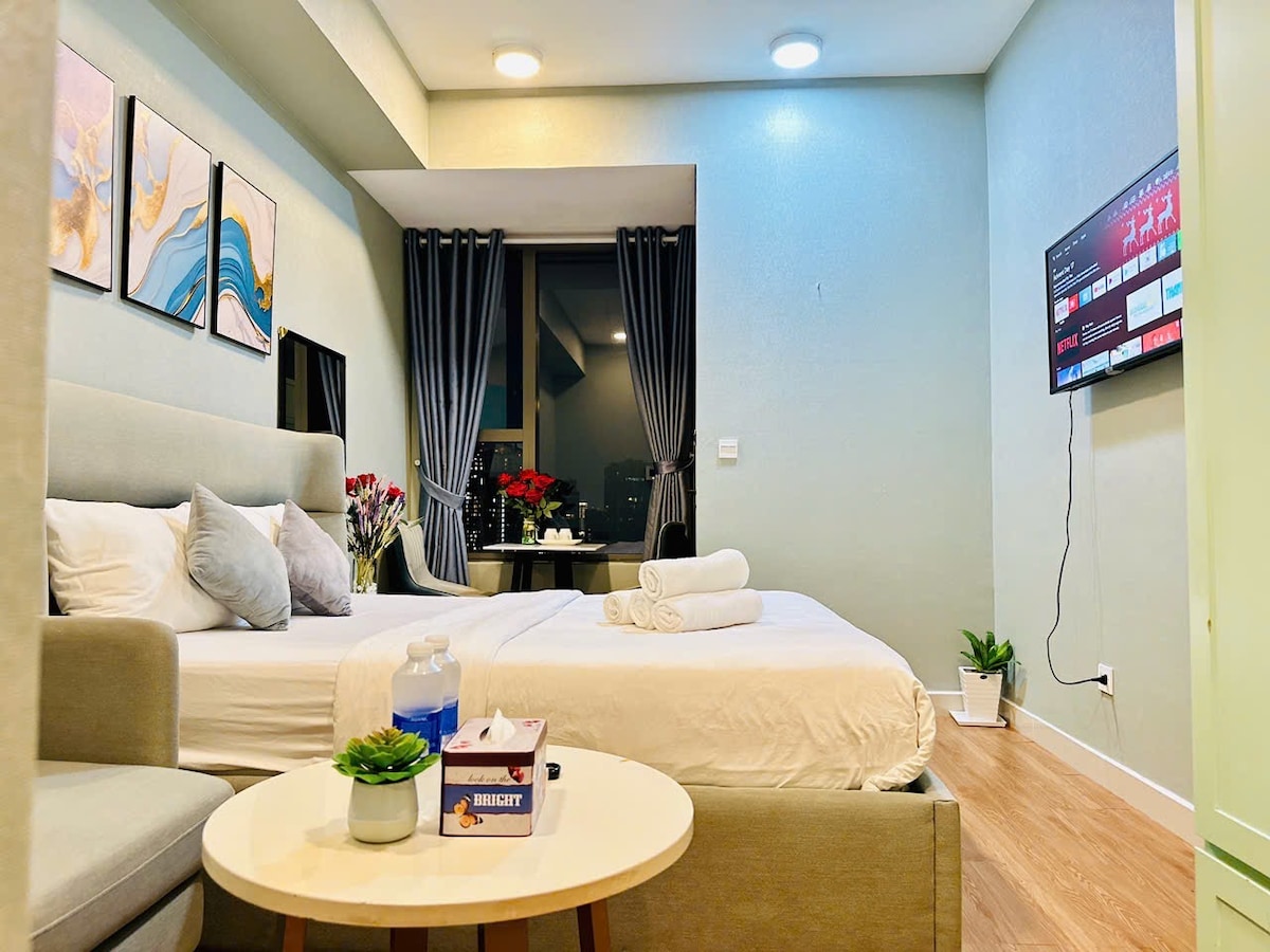 Í byggingunni er stór sundlaug með opnu útsýni og grænn garður sem skapar mjög tilkomumikið rými. Það besta sem hægt er að gera er að njóta sólsetursins í forgrunninum þar sem hægt er að sjá Saígon-ána renna um og sólin er smám saman að minnka til að skapa fallega liti. Þetta stúdíó býður upp á margar upplifanir til að finna óvæntar uppákomur á heimili sem henta mjög vel fyrir afmælisveislur, einkafundi, óvæntar uppákomur, afmælisdvöl, skrifborð, ferðagistingu, frí og fleira!