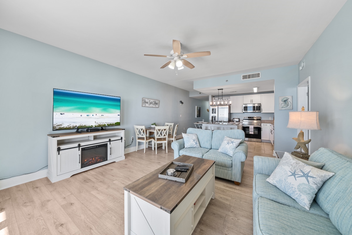 Upplifðu öll þægindin í þessari glæsilegu íbúð með sjávarútsýni og gistiaðstöðu fyrir sex manns á 5. hæð. Inniheldur sérstök bílastæði. Er með hjónaherbergi, kojuherbergi með tveimur kojum og queen-sófa með tveimur heilum baðherbergjum. Þessi rúmgóða íbúð er staðsett í hjarta Panama City Beach, með útsýni yfir magnaða sundlaugarverönd, nálægt veitingastöðum, verslunarmiðstöðvum, afþreyingu o.s.frv. Líkamsræktaraðstaða, matsölustaðir við sundlaugina, bar á staðnum