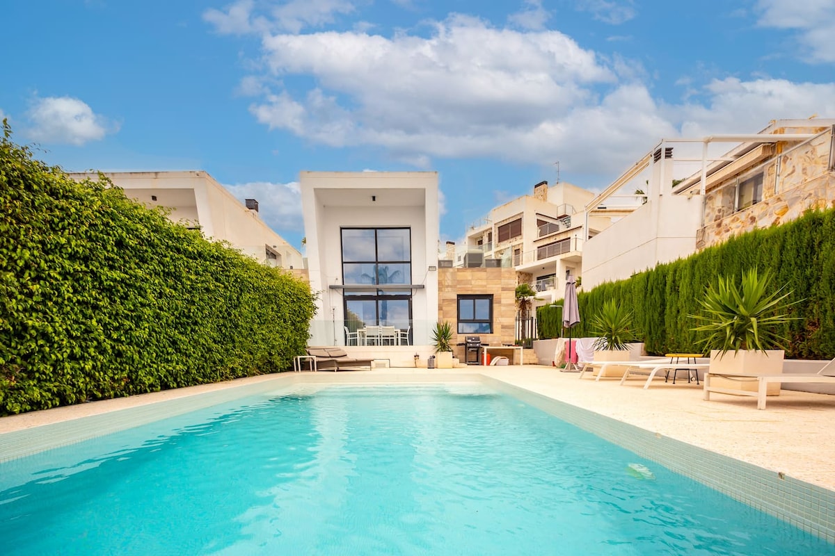 Nyere feriehus i moderne og koselig stil. Ett fullt møblert hjem med fokus på gode senger,dyner,uteområder,møbler og klimaanlegg på alle rom. Det er takparasoll på takterrassen samt parasoll utenfor stuen. Basseng ligger 10 meter fra vår eiendom Huset ligger i et stille og avskjermet boligområde som er barnevennlig. Det er kun eiere av boligene som kommer seg inn med bilen i området. Det er en port på utsiden. Barnevennlig. Kort vei til badestrender, matbutikker, restauranter, golfbaner, etc.
