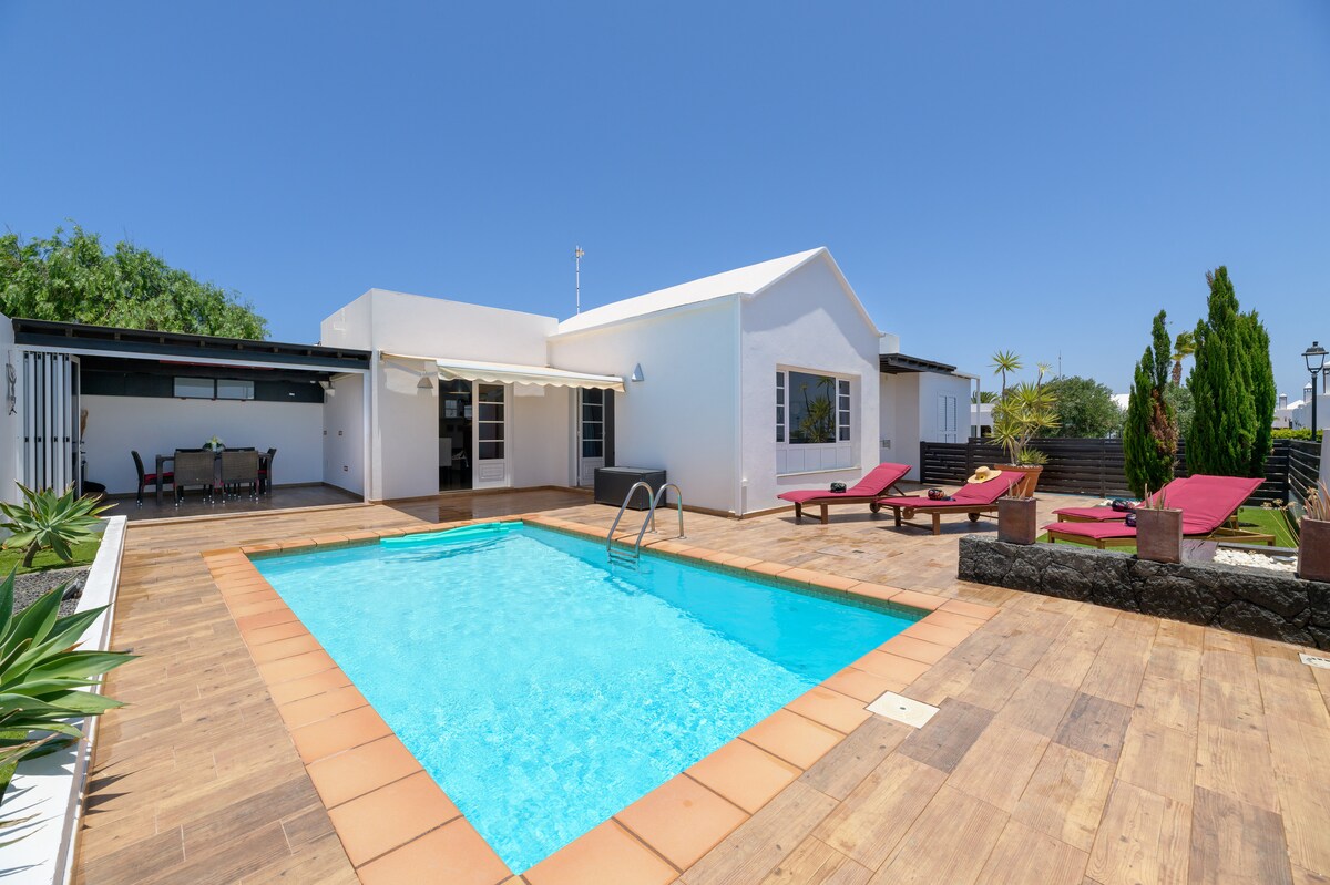 Þessi nútímalega lúxusvilla býður upp á sundlaug, stóran garð og sólbaðsaðstöðu, borðstofuborð utandyra og grill. Innifalið er þráðlaust net, sundlaugarhandklæði og hárþurrka. Fullbúið eldhús. Stórar nútímalegar tveggja hæða villur með loftkælingu í stofu og í tveimur svefnherbergjum. SmartTv í aðalstofunni. Þú getur verið viss um afslappandi frí í rólegu umhverfi, í göngufæri við alla bari og veitingastaði. Hentar fjölskyldum eða pörum sem leita að plássi og næði . Hægt er að hita laugina gegn aukagjaldi