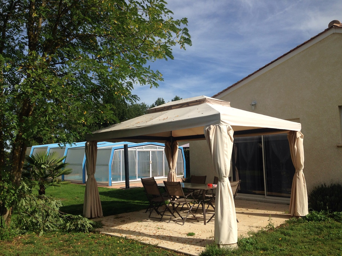 Þægilegt hús með yfirbyggðri og upphitaðri sundlaug 29 gráður frá apríl til nóvember , skógargarði og leikjum fyrir börn, plancha, grill fyrir 4 til 6 manns 2 svefnherbergi + svefnsófi. Sdb 2 vaskar ítölsk sturta aðskilið salerni, fullbúið eldhús. Stórt leikjaherbergi með: pool-borði, baby bonzini og ýmsum leikjum, salerni í sturtuklefa