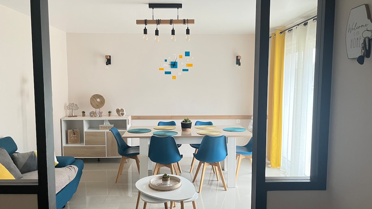 Húsið er um 110 m2 með einkaverönd 60 m2. Garðurinn er sameiginlegur með öðru húsi (möguleiki á að leigja það fyrir 4 manns í viðbót). Þú hefur við og öll þægindin sem þú þarft til ráðstöfunar, bílastæði í 30 metra fjarlægð, boble bath, Net, hljóðbose, Canal+, canalsat, mjög vel búið eldhús. Húsið er fullt af birtu allan daginn, mjög þægilegt og hlýtt. Rólegt jafnvel þótt það sé við aðalstrætið.