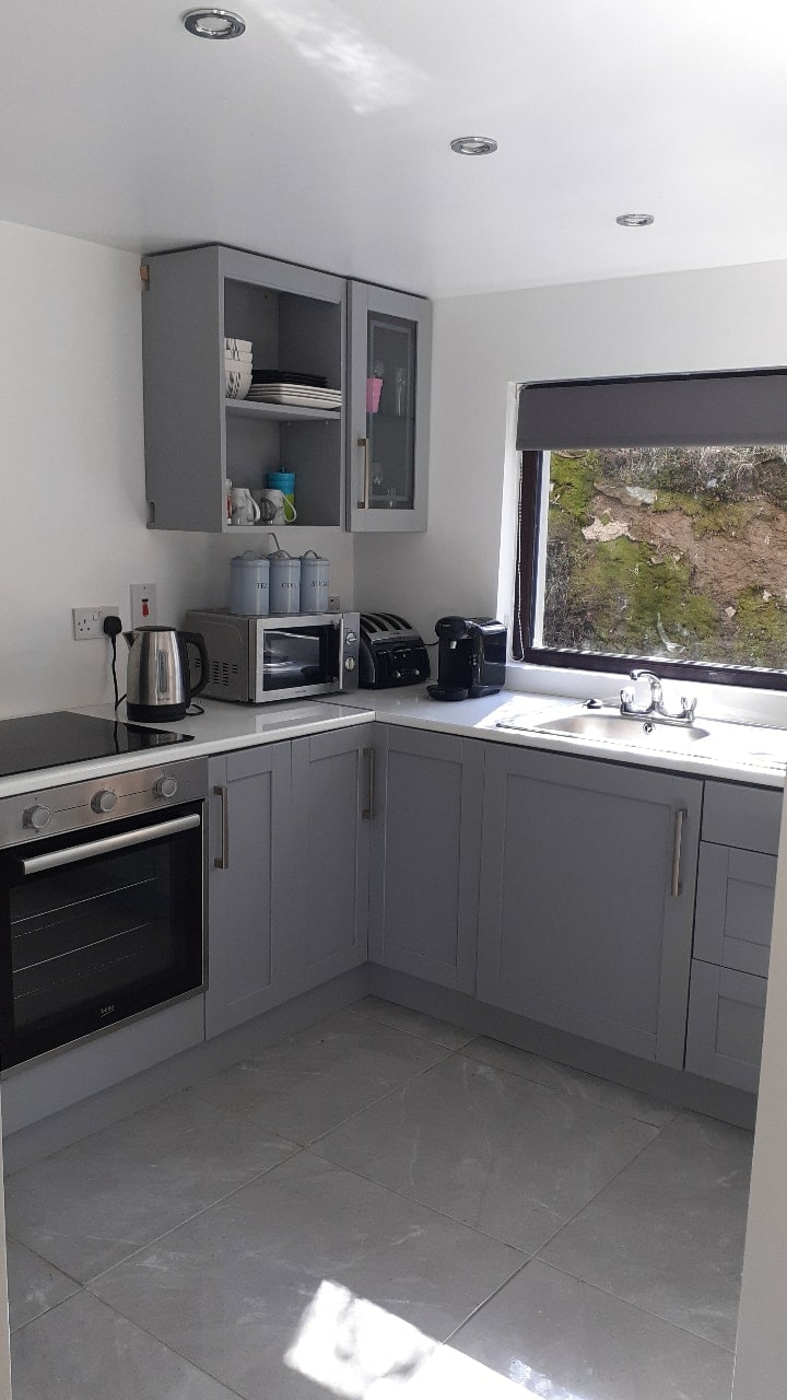 Allur staðurinn . Yndislegur, léttur og loftmikill staður með sjávarútsýni, opnum eldi og svefnplássi fyrir 2. Eigin inngangur í alla eignina með víðáttumiklu sjávarútsýni að ströndinni frá eigninni . Fullbúið eldhús, ókeypis te & kaffi og nokkur grundvallaratriði í eldhúsi: olía, mjöl, salt og pipar. Borðkrókur, setustofa og ensuite double bedroom. Sturtuherbergi niðri í fornbókabúðinni okkar sem er opnuð 1-5 yfir sumarmánuðina.