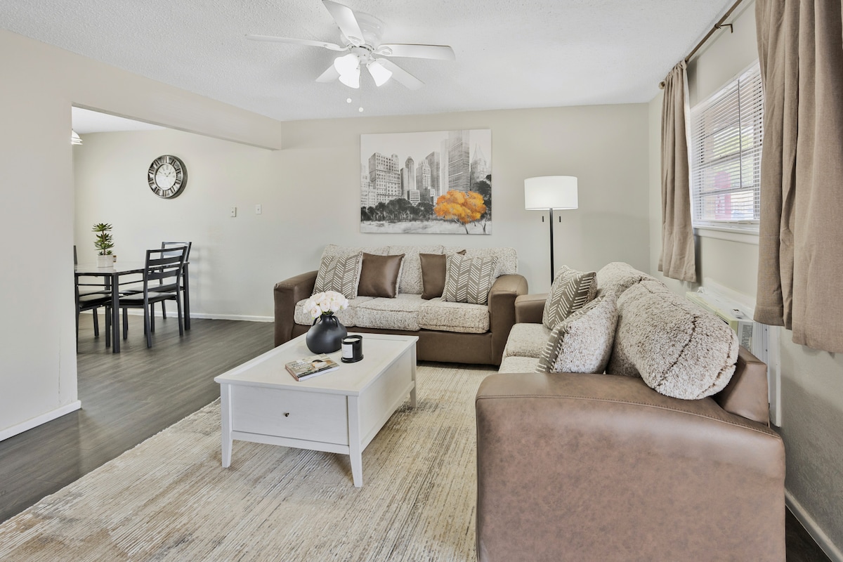 Njóttu næstu dvalar í Hoff Gardens. Þessi 1177 fermetra íbúð á efri hæð í miðbæ Lubbock er ein af fjórum fullbúnum íbúðum í samstæðu í aðeins 2 km fjarlægð frá Texas Tech University. Þessi eining hefur verið endurnýjuð að fullu að innan og er með öllum þægindum svo að þér líði eins og heima hjá þér. Njóttu þægilegra húsgagna, stórra snjallsjónvarpa og árstíðabundins aðgangs að sundlaug! Með svo miklu plássi er nóg pláss til að breiða úr sér. Fullkomið fyrir dvöl til lengri og skemmri tíma.