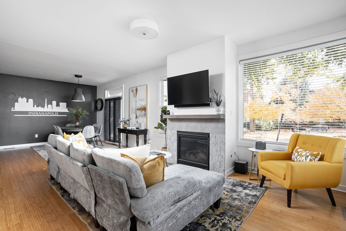 Upplifðu nútímalegan lúxus í þessu fullbúna afdrepi við Fountain Square með 4 svefnherbergjum og 3 böðum! Fullkomið fyrir fjölskyldur eða hópa (gæludýr innifalin!), tvær vistarverur, kvikmyndaherbergi á þriðju hæð, glæsileg eldhús með granítborðum og íburðarmikil hjónasvíta með baðkeri, flísasturtu og svölum. Svefnfyrirkomulag fyrir allt að tvær fjölskyldur. Skref frá Geraldine's, Fletcher Place og líflegu áhugaverðu stöðunum í miðborg Indy. Fullkomið frí bíður þín!