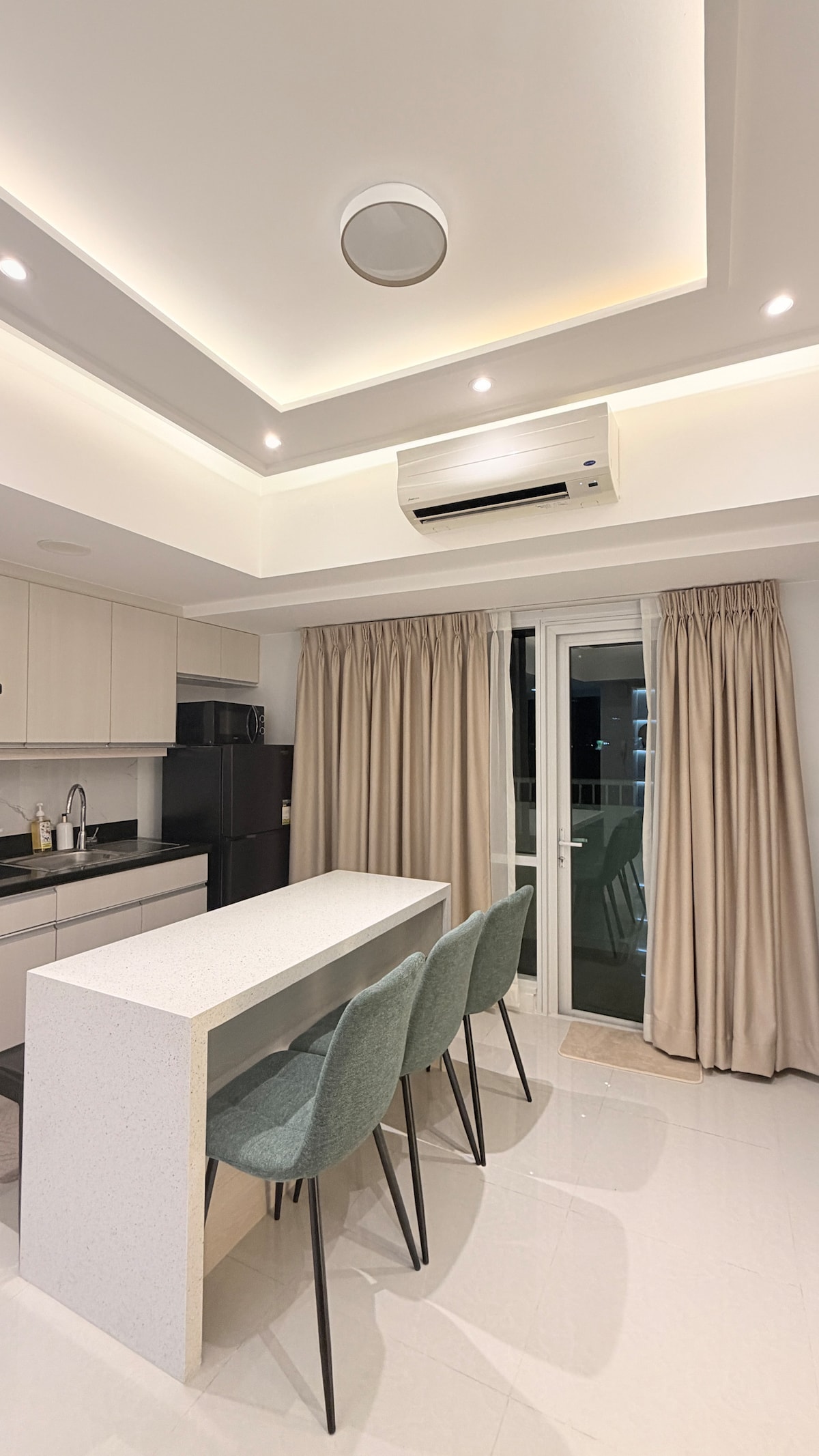 35fm stúdíó með svölum • 200Mbps þráðlaust net • King-rúm + 2 gólfdýnur • Fullbúið eldhús + viðargólf • Þvottavél • Innifalið heitt og kalt vatn • Afgirt íbúð með öryggisgæslu allan sólarhringinn • 2 sundlaugar + leikvöllur • 7/11 & market beint fyrir utan innganginn Í nágrenninu (á bíl): • Samal Ferry – 3 mín. • Flugvöllur – 8 mín. • Dusit Thani – 8 mín. • Insular Hotel – 10 mín. • Puregold – 7 mín. • Azuela Cove – 12 mín. • SM Lanang / SMX – 15 mín.