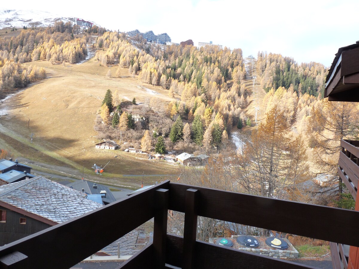 Stúdíó 26 m2 staðsett við rætur brekknanna með útsýni yfir Mont BLANC. Hægt að fara inn og út á skíðum. Verslanir, veitingastaðir, skíðaskólar, leiga á búnaði í húsnæðinu, leikjaherbergi o.s.frv.... Ókeypis sjónvarp til að komast í Plagne Centre (kvikmyndahús, apótek o.s.frv.). Ókeypis bílastæði með beinu aðgengi að lyftu. Ókeypis skutlur milli stöðva eru við rætur húsnæðisins. Hægt er að fá skíðaskáp til að komast í brekkurnar fyrir neðan ESF.