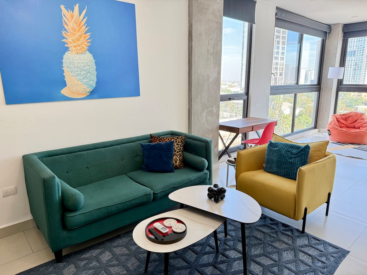 Nútímaleg og þægileg íbúð með öllu sem þú þarft fyrir fullkomna dvöl. Þetta notalega rými er með svefnherbergi með queen-rúmi sem er tilvalið til að hvílast og svefnsófa sem verður að tveimur einbreiðum rúmum, fullbúnu og rúmgóðu baðherbergi, stofu með sjónvarpi til að slaka á, borðstofu og fullbúnu eldhúsi svo að þér líði eins og heima hjá þér. Njóttu sameiginlegra svæða byggingarinnar, þar á meðal sundlaugar, ræktarstöðvar og vinnusvæða