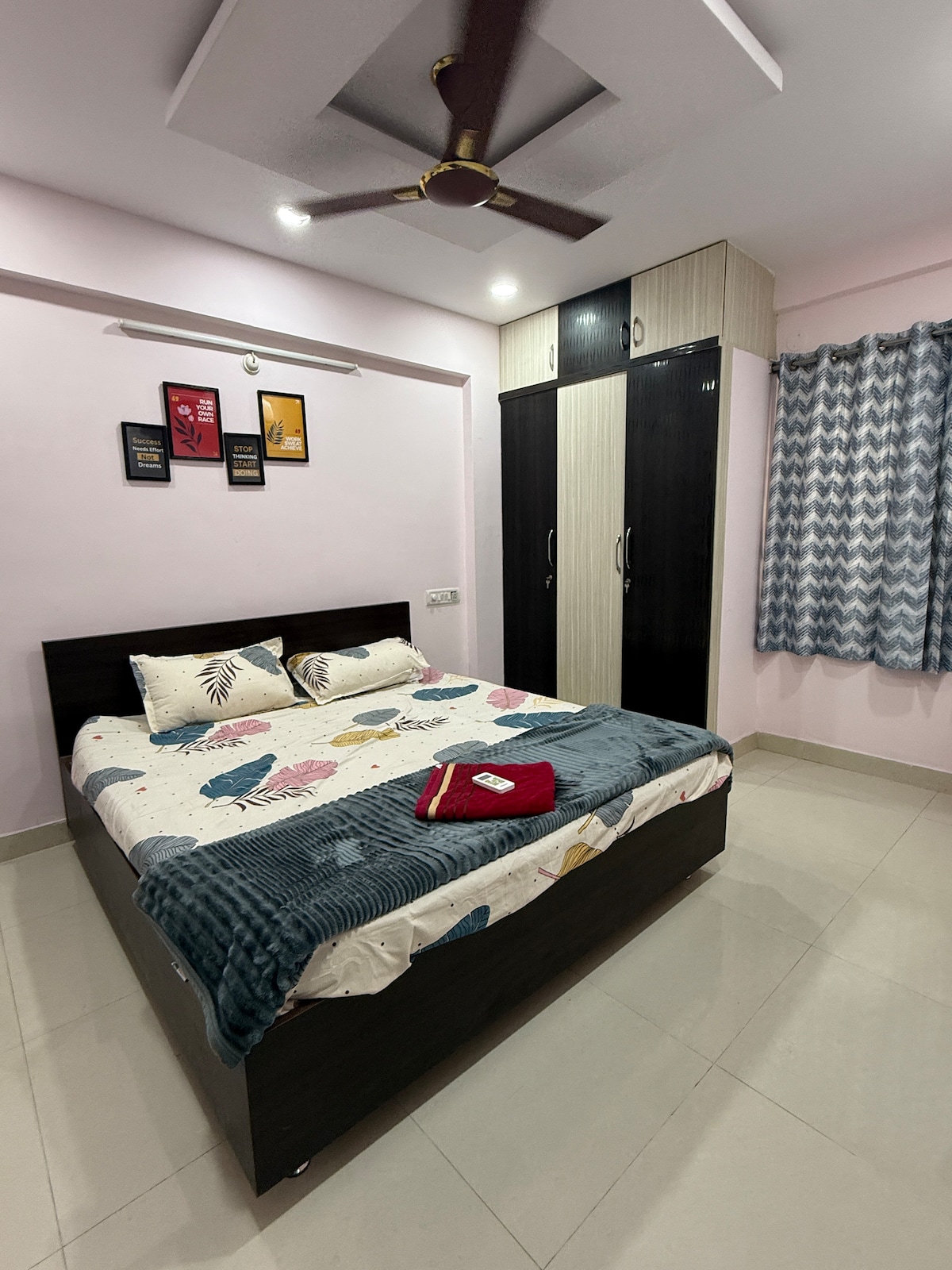 Welcome to our stylish 3 BHK apartment, ideal for short or long stays. Enjoy 3 AC bedrooms with attached baths, a cozy living room with a 43" Smart TV, high-speed Wi-Fi, and an indoor swing. The fully equipped kitchen includes a gas stove, microwave, RO purifier, fridge, and utensils. Conveniently located near Hitech City Metro, Usha Malpuri's Kitchen (100 m), US Visa Center (1 km), Cable Bridge, and major IT hubs..