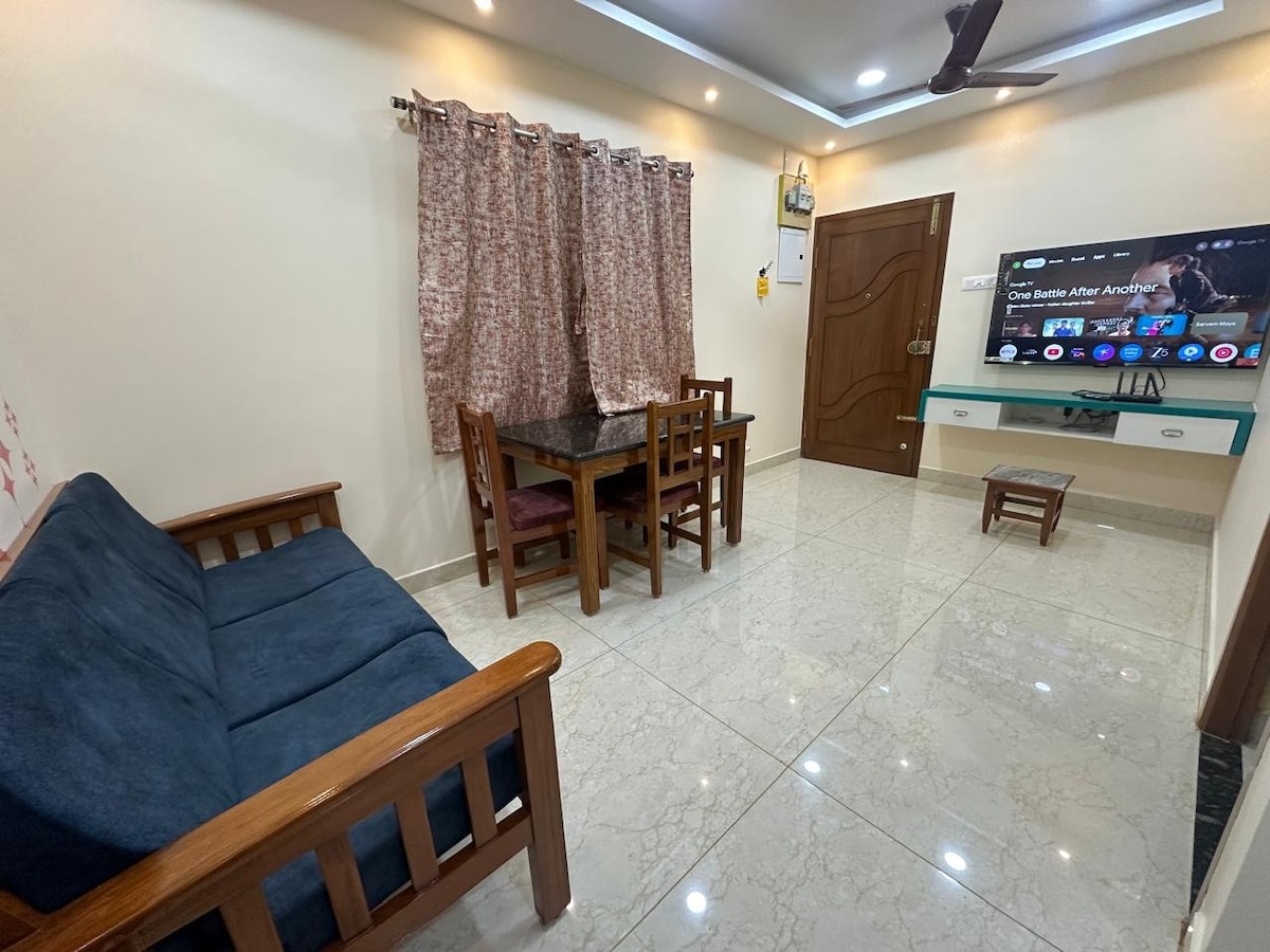 Notaleg, fullbúin húsgögnum 2 BR íbúð staðsett í Pallavaram, steinsnar frá flugvellinum. Það er af 2 rúmgóðum BR með eigin aðliggjandi baðherbergi og 2 svalir með glæsilegu útsýni yfir nærliggjandi svæði. Fríðindi: Líkamsrækt, sundlaug ,matvörubúð og læknisverslun, sem gerir það að fullkominni staðsetningu fyrir þá sem þurfa greiðan aðgang að daglegum nauðsynjum. Hvort sem þú ert fjölskylda í fríi eða vinahópur sem ferðast saman er þessi íbúð fullkominn valkostur fyrir þig.