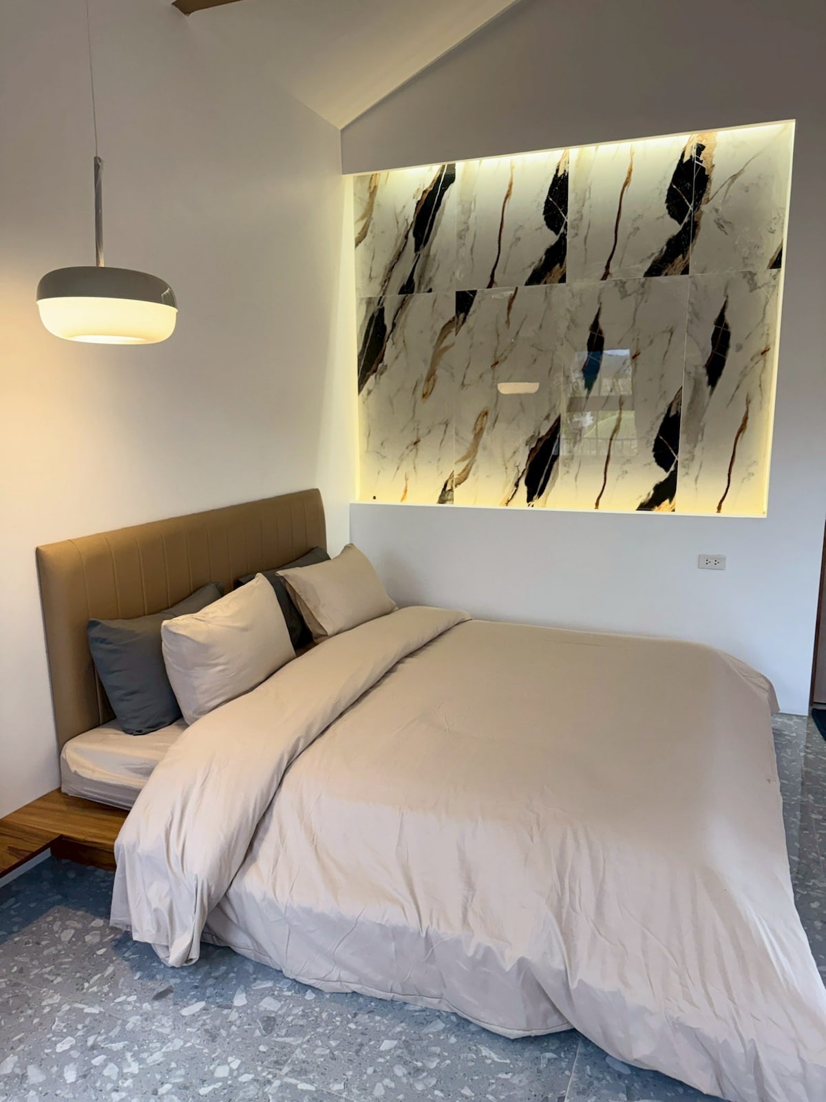 Modern-style house with 3 bedrooms, each equipped with air conditioning and an air purifier. It features a spacious living room, a large fully equipped kitchen, a laundry room, and a private garden with a gated parking area for up to 3 cars. Conveniently located close to town, yet peaceful and quiet.