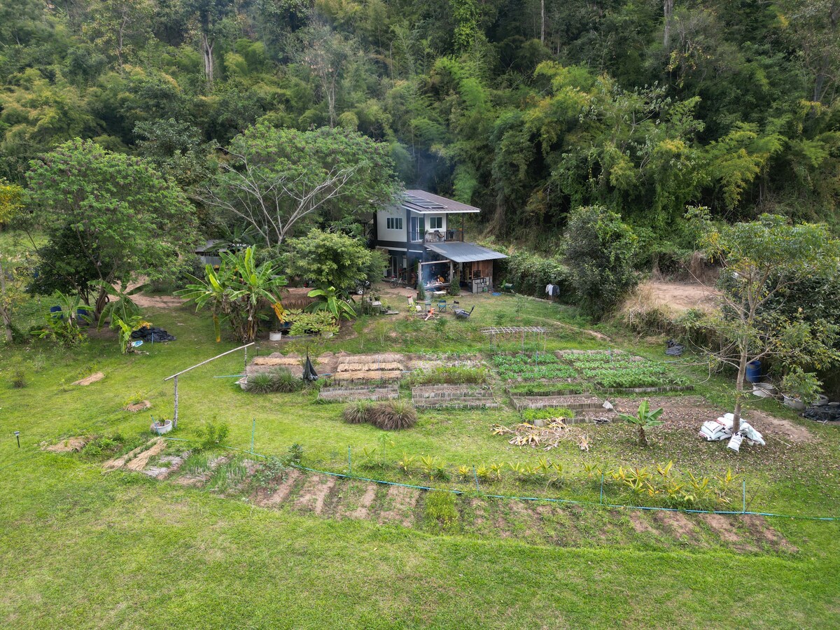 Two-story wooden house surrounded by fruit trees. Tucked away next to our art studio, the kitchen on the ground floor provides a space for cooking together. Go up the stairs reveals a natural connection with open balcony. With a bedroom that be opened to the wind, Stay close to the embrace of forest all day long. At dusk when the weather is cool, we sit around the bonfire, Let our hearts be warm. Listen to eternal stars, Blessed the energy from MotherNature (Pachamama) and Doi Luang ChiangDao
