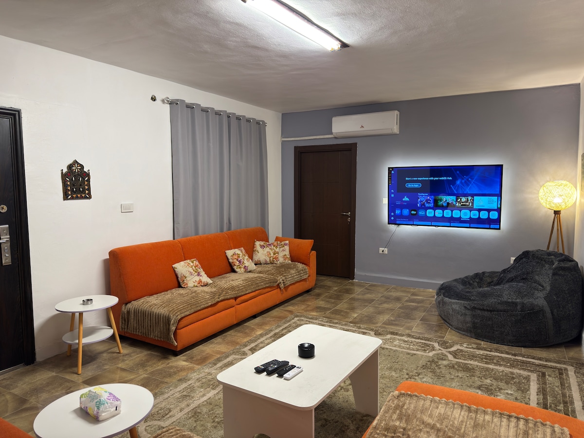 استمتع بإقامة فندقية راقية في قلب عمّان، بتصميم عصري راقٍ ومريحة للغاية. تضم الشقة غرفة معيشة أنيقة مع شاشة سمارت 65 بوصة، ومطبخًا مجهزًا بالكامل، وغرفتي نوم واسعتين إحداهما بسرير كبير (King Size) والأخرى بسريرين مفردين مثاليين. يوجد تراس خارجي خاص للجلوس، مع إنترنت فائق السرعة، ومواقف مجانية قريبة من الموقع. تقع الشقة في منطقة ضاحية الأقصى الحيوية، بالقرب من وزارة الصحة والمطاعم والمقاهي والأسواق ى، وتبعد دقائق عن الدوار السابع وشارع المدينة . موقع مثالي للعائلات أو الزوار في وسط عمّان.