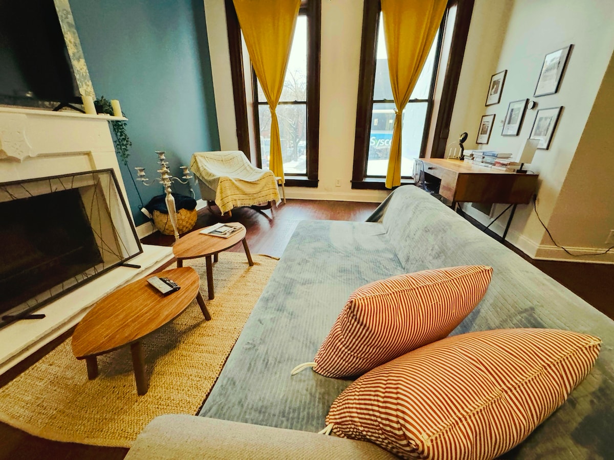 Helst staðsett aðeins hálfa húsaröð frá Michigan Avenue, þessi bjarta og opna íbúð á 3. hæð státar af úthugsuðum herbergjum til þæginda svo að þú hafir allt sem þú þarft til að njóta dvalarinnar í stíl! VINSAMLEGAST ATHUGIÐ: 3. hæð ganga upp (engin LYFTA) Lítill hverfisbar er á annarri hæð hússins. Þeir bera virðingu fyrir nágrönnum okkar, en þeir spila tónlist sem hægt er að heyra í stofunni en sjaldan, ef nokkurn tíma, í svefnherbergjunum.