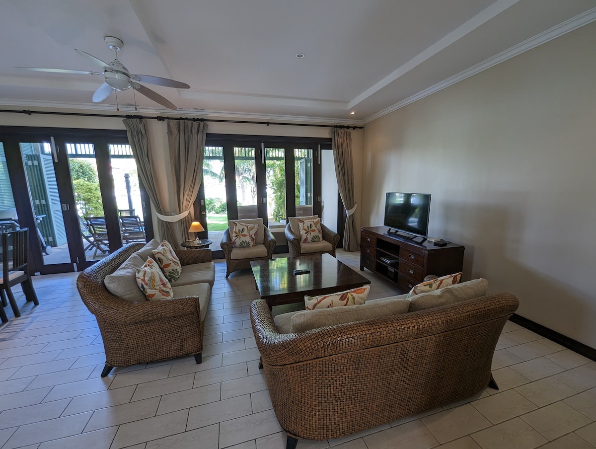 Certified by Health +Tourism Dept to rent out Fullkomlega staðsett á Eden-eyju á rólegu, þroskuðu svæði - 1. hæð - þannig að barnaskápur með engum aðgangi að opnu vatni - útsýni yfir flóann - stórt opið eldhús + stofa opnast út á góðar svalir fyrir al fresco borðhald - hjónaherbergi með king-size rúmi, sérbaði + sérsturtu með hurðum út á aðalsvalir - Í 2. svefnherbergi eru tvíbreið rúm, sturta, salerni og einkaverönd Loftræst að fullu - ókeypis notkun á Golf Buggy