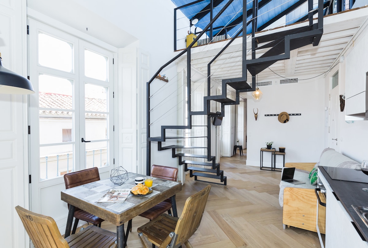 Uppgötvaðu einkafrí í minimalísku rými með opnu rými, nútímalegum húsgögnum og skreytingum og einkasvölum. Eitt skref frá öllum hápunktunum, í hjarta Malaga. Taktu ótrúlegt útsýni yfir Alcazaba og dómkirkjuna fyrir framan Plaza de la Merced. Íbúðin er á Plaza de la Merced horninu (Picasso fæðingarstaður), í brattri götu til Gibralfaro kastala. Allir helstu staðir Malaga eru í göngufæri. Og stórt bílastæði er í boði fyrir gesti okkar.
