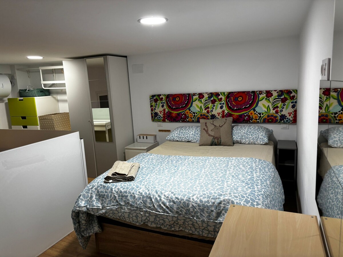 The all outside and very bright apartment is located on Calle Mayor, right front of one of the entrance to the Plaza. Húsgögn og tæki . Það samanstendur af: Svefnherbergi, eldhús, stofa sem öll eru sambyggð einu herbergi með loftkælingu og kyndingu og aðskildu baðherbergi. Eldhúsið er fullbúið. Stofan samanstendur af 140 cm svefnsófa, sjónvarpi, IPOD og arni til skreytingar. Næst er svefnherbergið sem samanstendur af 2 rúmum af 1,90 x90 og skáp.