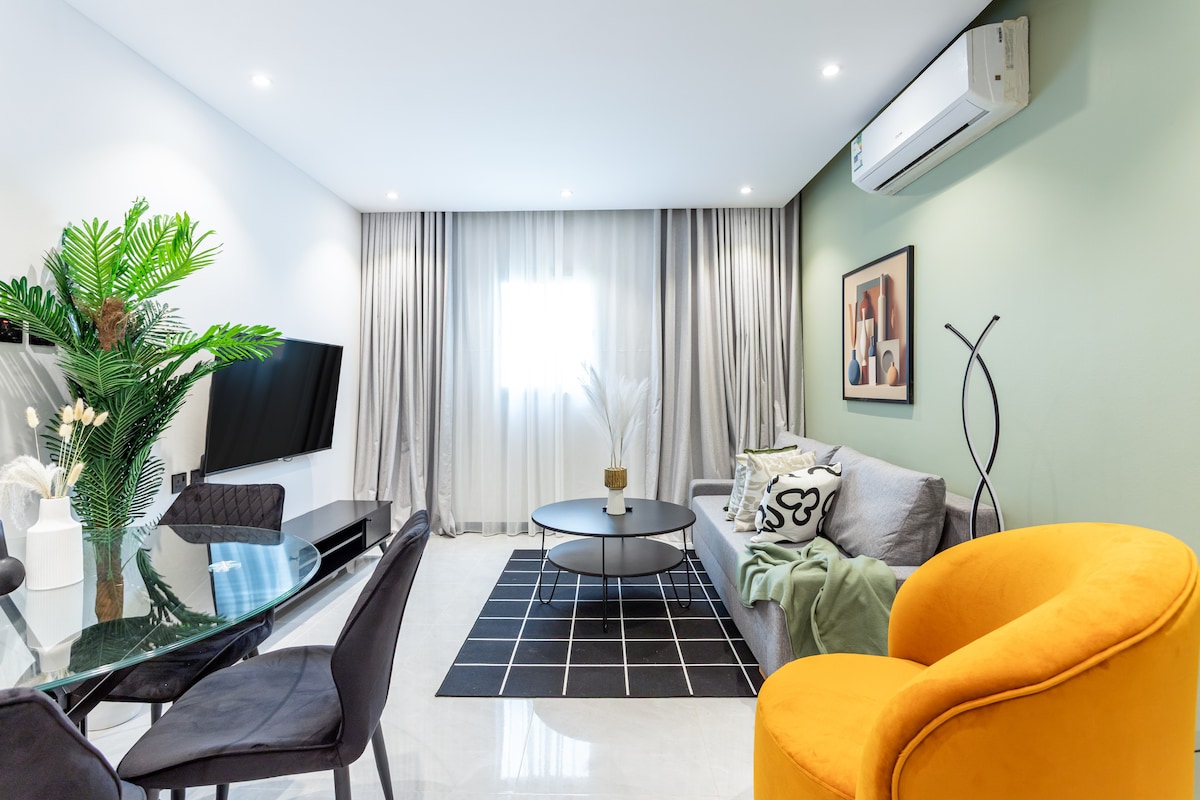 Boho-style retreat in Al Narjis! Cozy 1BR apartment with living area, equipped kitchen, 2 bathrooms, and a 4-seat dining table. Natural plants add freshness, soft lighting and warm tones create a relaxing vibe. Perfect for solo travelers, couples, or short stays. Fast Wi-Fi, AC, and parking included. Enjoy comfort, style, and a peaceful Riyadh stay in a brand-new, inviting space.