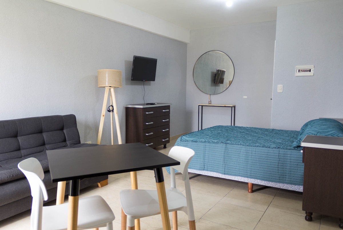 🏠 Verið velkomin í stúdíóíbúðina okkar í Campus Vista, nútímalegu íbúðarhúsnæði í Pilar með öllum þægindum fyrir þægilega dvöl. Einkaöryggi allan sólarhringinn, tvær sundlaugar (önnur upphituð), gufubað, líkamsrækt, vinnusvæði og yfirbyggður bílskúr eru meðal þeirra þæginda sem eignin býður upp á. Eignin er 🛏️ fullkomin fyrir allt að 4 manns og er með queen-rúm, tvöfaldan svefnsófa og einkaverönd sem hentar vel til afslöppunar.