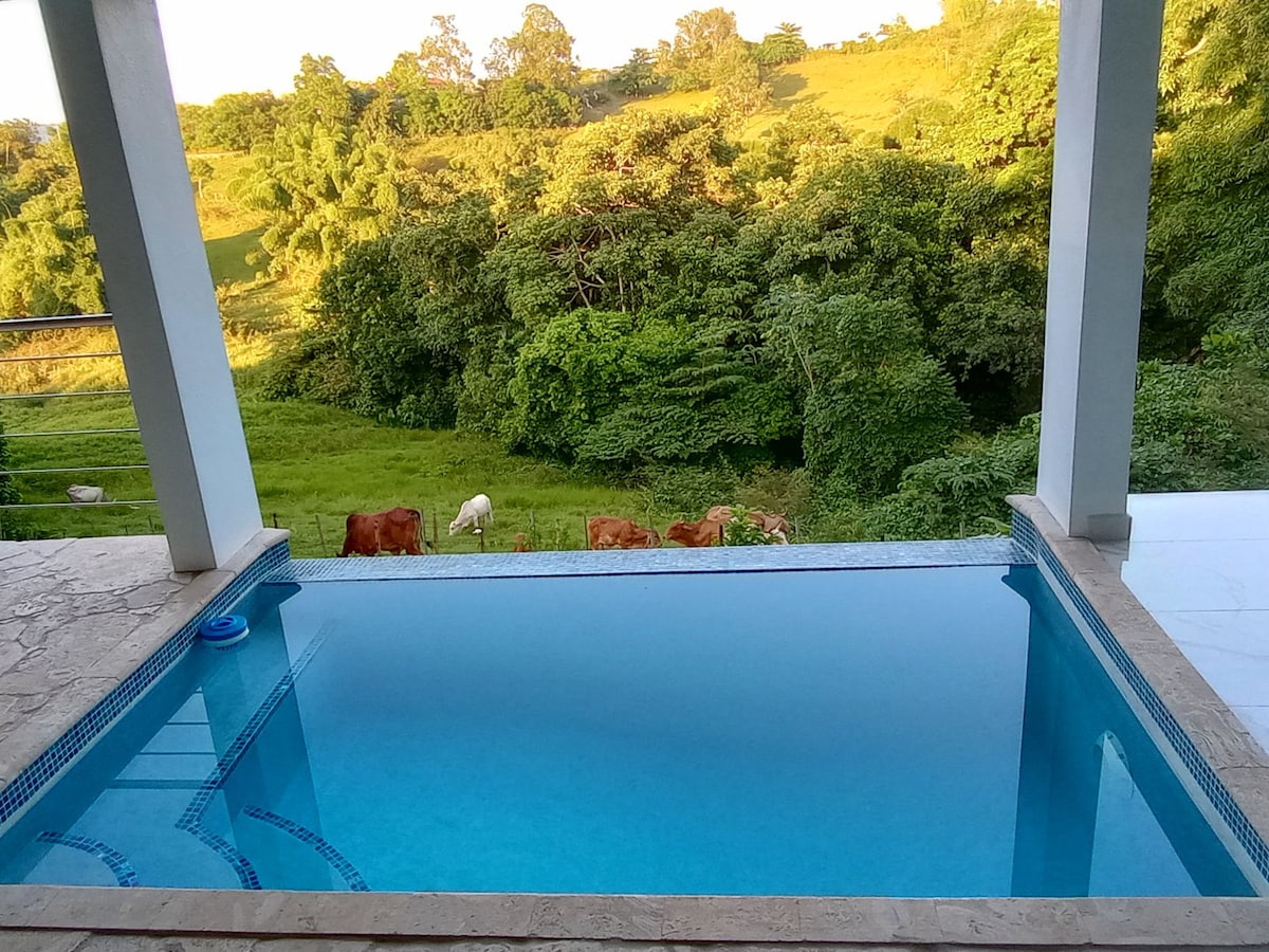Lujoso apartamento en el pueblo de Aguada. Tiene piscina con calentador y una hermosa vista al campo. Perfecto para parejas en busca de disfrutar de un momento especial e inolvidable. Amplio cuarto con aire acondicionado con cristales que permiten disfrutar de una hermosa vista mientras se descansa. Disfrute de una experiencia relajante en este alojamiento, está a minutos de las mejores playas, restaurantes y lugares de interés turístico del área oeste de P.R.