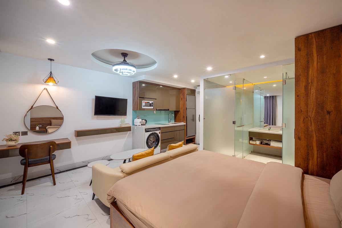 Gaman að fá þig í fríið á Le Cap Hotel, steinsnar frá Dragon Bridge. Þetta glæsilega stúdíó býður upp á þægindi, sjarma við ströndina og úrvalsþægindi eins og friðsæla sundlaug, notalegt kaffihús og háhraða þráðlaust net. En það sem stendur upp úr? Glænýja Vinabeast Gym á þakinu okkar — fullbúin hágæða líkamsræktarstöð með útsýni undir berum himni. Þetta er ekki bara líkamsræktarstöð á hóteli heldur ein sú besta í Da Nang. Fullkomið fyrir afslöppun, vinnu eða þjálfun.
