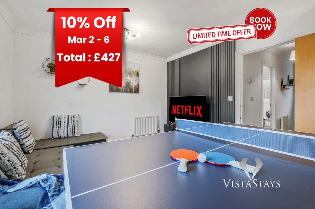 Gaman að fá þig á besta heimilið þitt í Astley. Þessi glæsilega 6 herbergja eign sameinar rými, stíl og þægindi sem eru hönnuð fyrir fjölskyldur, hópa eða fyrirtækjagistingu í leit að einhverju sérstöku. • Sérstakt sundlaugar-/leikjaherbergi – fullkominn staður til að slaka á, skemmta sér eða halda börnunum uppteknum. • Opið umhverfi með risastóru snjallsjónvarpi • Einkagarður • Borðstofuborð sem tekur 8 manns í sæti fyrir fjölskyldumáltíðir eða kvöldverð fyrir teymi. • Bílastæði fyrir allt að 6 bíla ásamt hleðslutæki fyrir rafknúin ökutæki á staðnum