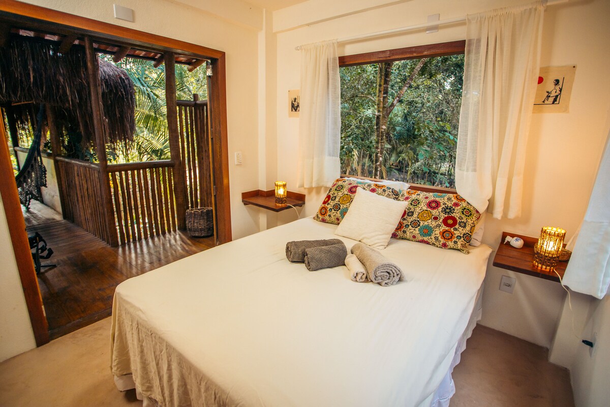 É um espaço calmo e cheio de estilo à 200 metros da praia, em meio a vegetação nativa! Somos LGBTQIAP+ friendly e por estarmos afastados do núcleo da comunidade desfrutamos de silêncio e tranquilidade mas a cinco minutos do agito! A suíte com vista para as árvores é garantia de descanso. A cozinha com teto de piaçava é linda e está preparada com o necessário. A sala de banho conta com espaços reservados que garante a sua intimidade. Relaxe neste espaço! Você vai adorar!