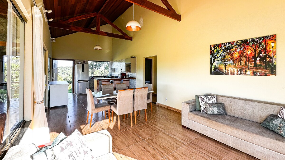 Við erum hús umkringt náttúrunni, athvarf í Capixabas fjöllunum fyrir þá sem leita að fersku lofti, notalegt loftslag. Staðsett í Domingos Martins, einn af eftirsóttustu áfangastöðum Santo State, það er 55 km frá Vitória og 3 mínútur frá miðbæ Campinho. Í húsinu eru 5 svítur, stofa og stórt búr, fullbúið eldhús, sælkerasvæði og upphituð sundlaug. Rúmar 14 manns, tilvalið fyrir hvíld og tómstundir með fjölskyldu og vinum.